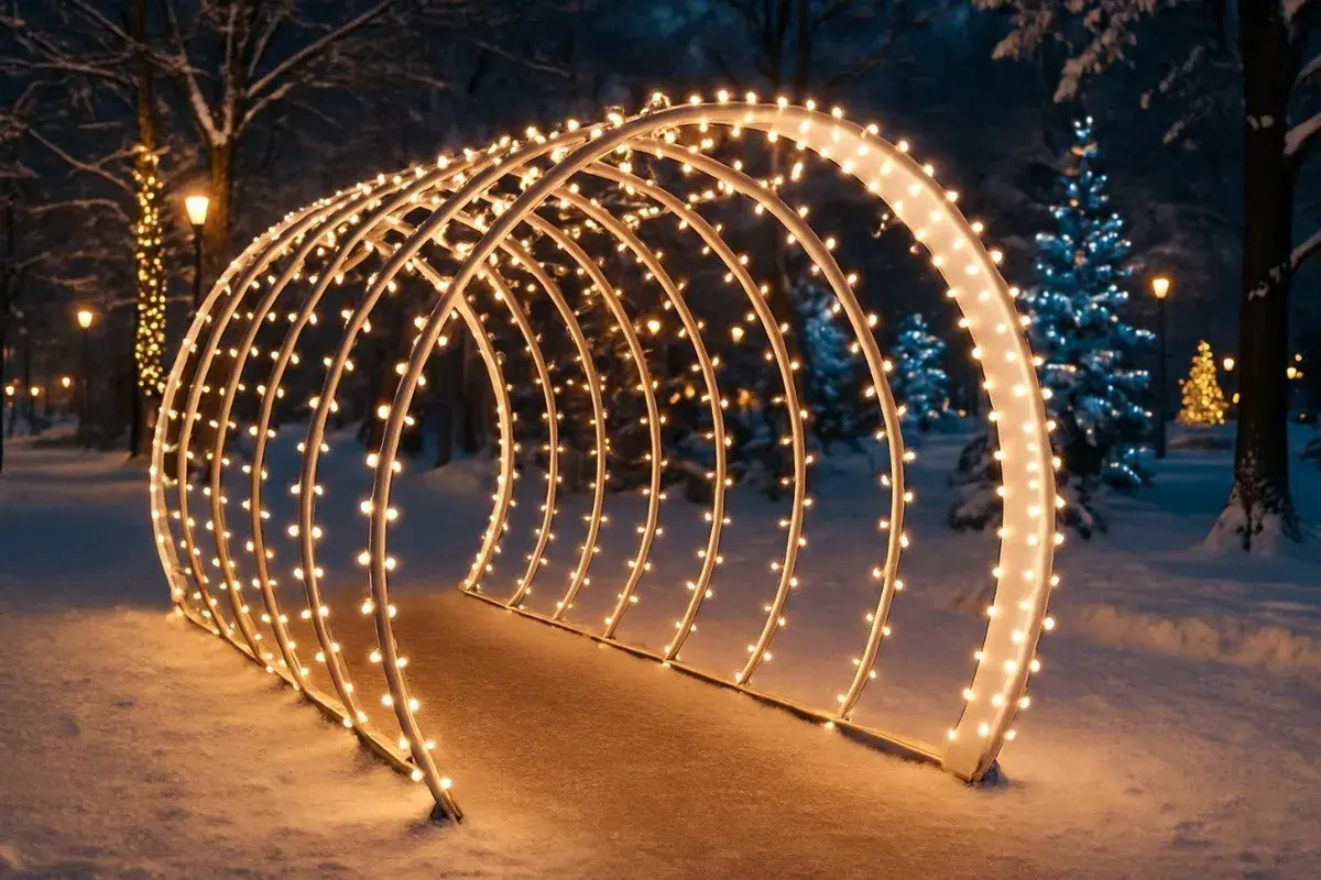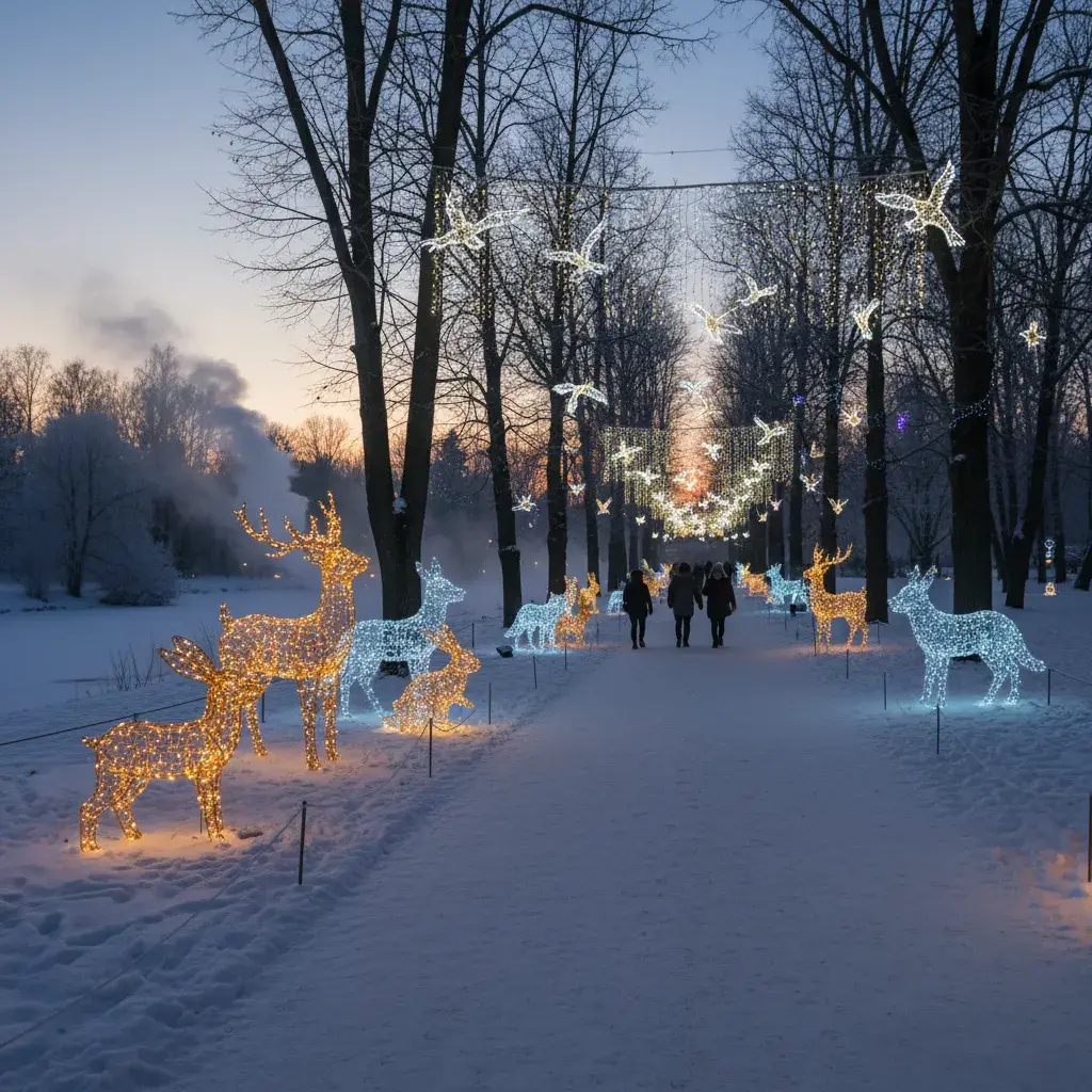 Полный цикл услуг: Предоставляем монтаж световых фигур, подключение, обслуживание, а также профессиональный демонтаж и рекомендации по компактному хранению. Оформление парка под ключ.