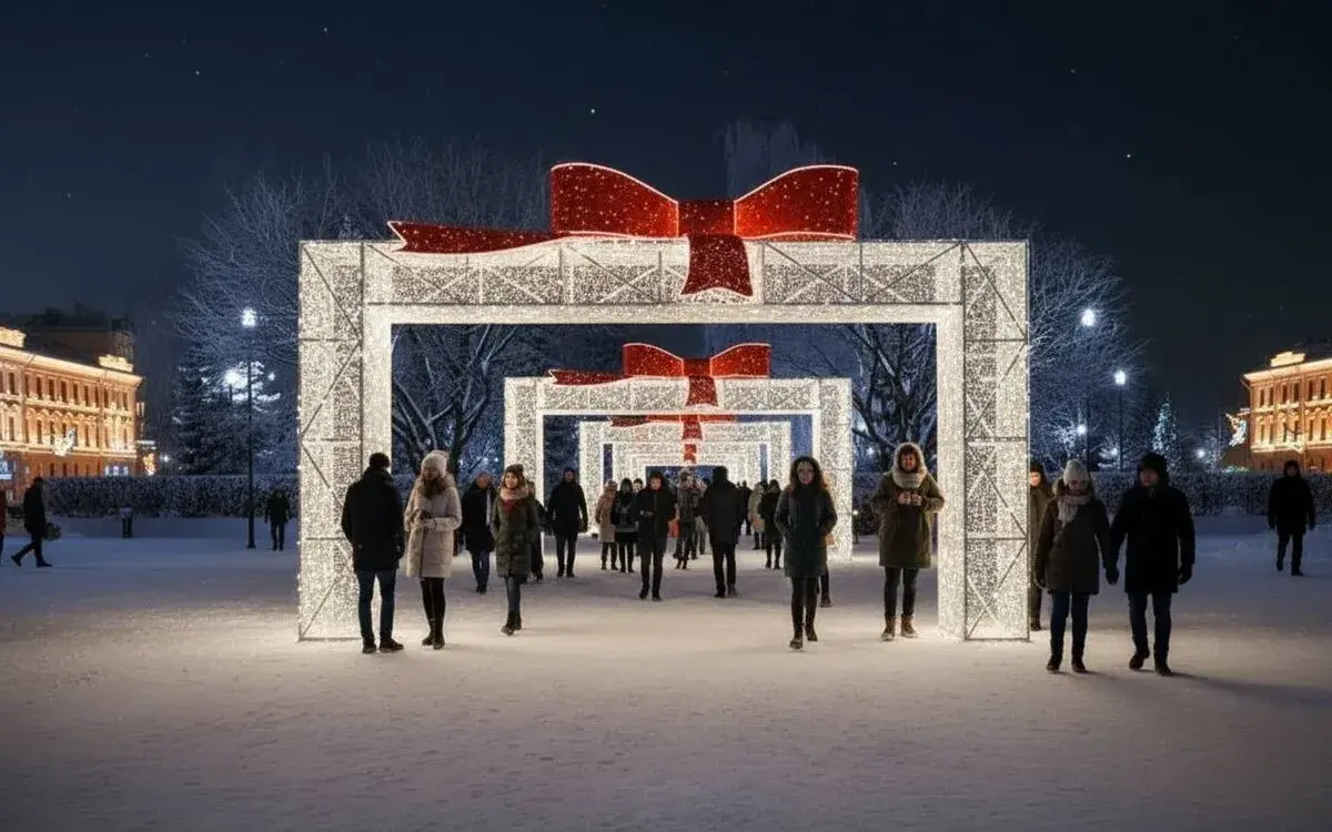 Новогодние тоннели и арки: Эффектные конструкции для входных групп и пешеходных зон, приглашающие погрузиться в атмосферу праздника.